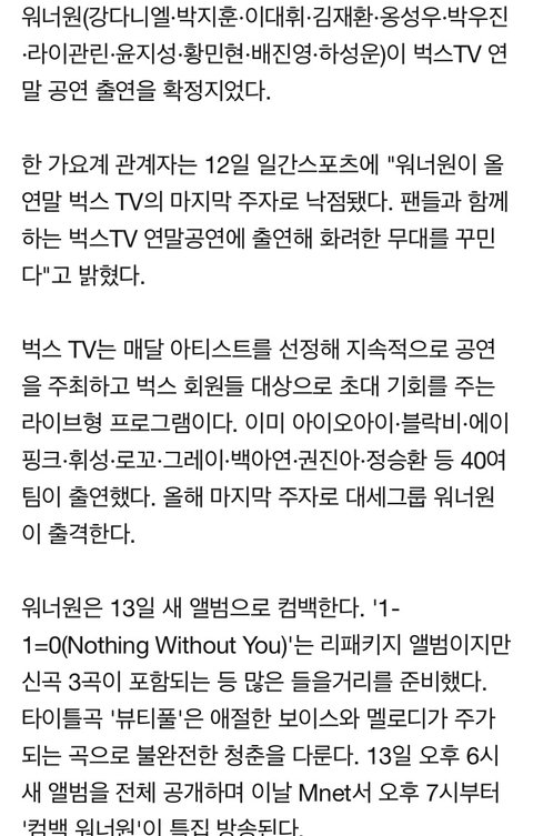 워너원 벅ㅅ tv 연말공연 출격