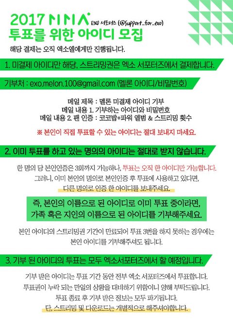 엑소엘의 멜룐 투표율 증가를 위해 멜룐 아이디를 모집하고 있음