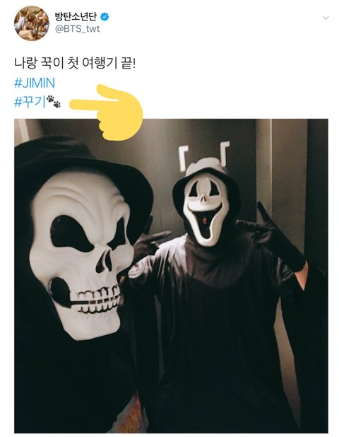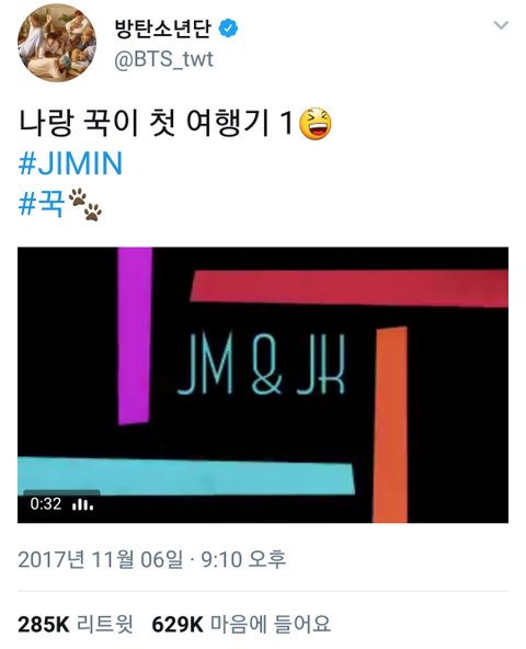 이번에 ama잘 갔다오겠다며 지민이 올린 정국과 함께찍은 영상에 붙인 #JIMIN #꾹꾸 !!!! (발자국이 또..!)