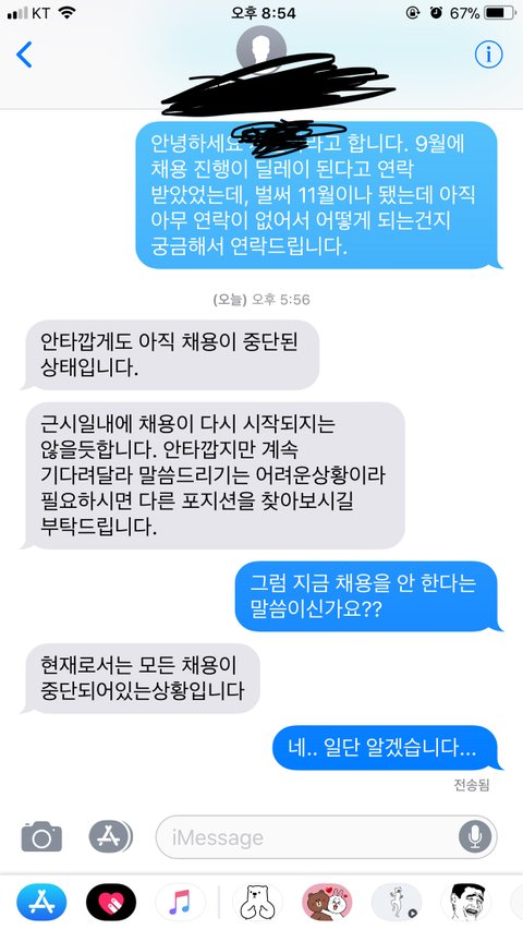 1차면접을 보고 면접을 보고서 2주후쯤 2차면접을 보고 또 2주후쯤 통과가 되었으니 추후협의를 하자고 3일안으로 서류를 달라고 하더라고요. 그 뒤로 갑자기 채용이 딜레이 될것 같다며 기다려 달라하더군요.. 지금까지 연락이 없어 오늘 문자를 보냈더니 채용이 중단됐다네요... 채용이 다시 진행되지는 않을것 같다고 하네요 .. 하아... 제가 정말 원하던 일이었는데... 이제 겨우 됐다 생각했는데... 너무 짜증나네요