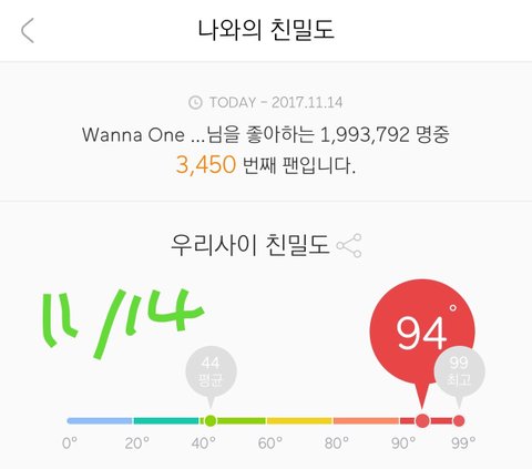 우와~우와~ 우와~ 대박대박대박 서양수박에서 난 워너원 1993792명의 팬 중에서 3450번째. 꽤 높네 ㅋ 나 별로 하는거없는 팬인줄 알았는데 ㅋㅎㅎ 이런거라도 높네 ㅋ