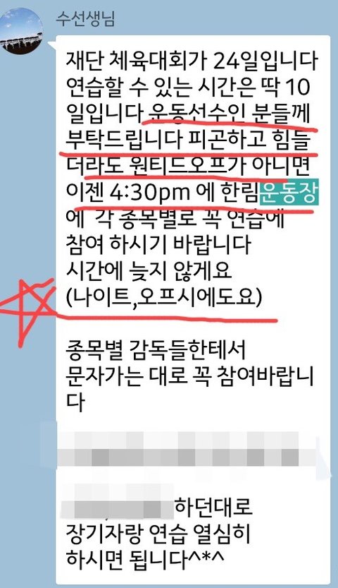 각 종목의 선수들은 강제로 차출 당하고, 체육대회 한달 전부터 매일 오후 네시반부터 여섯시까지 연습을 강요받았습니다.