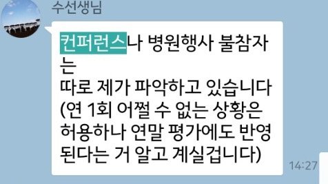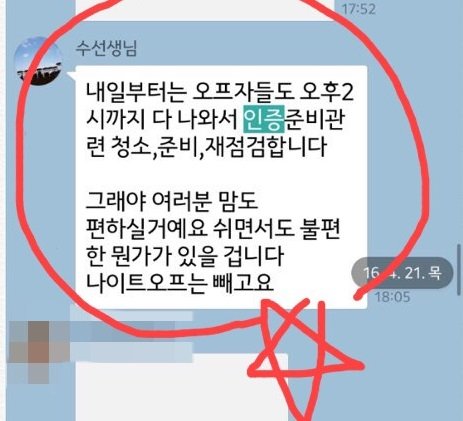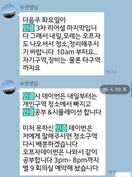 (아래는 인증평가 준비 시 근무시간 변경에 관한 카톡 캡처 자료입니다.)