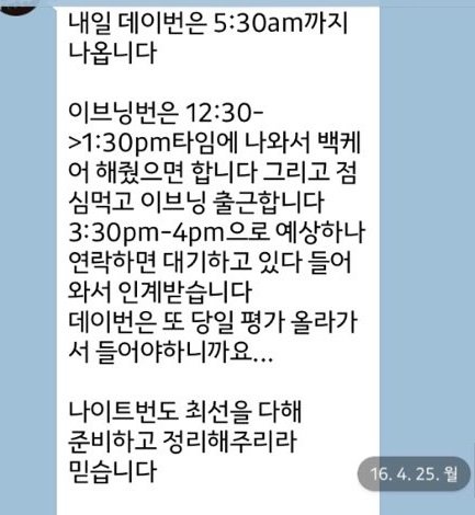 더블 듀티에 맞먹는 근무를 강요받으면서도 추가 수당은 꿈도 못 꿨고, 개인 사정이 있다는 말도 할 수 없을 정도록 강압적인 분위기였습니다.