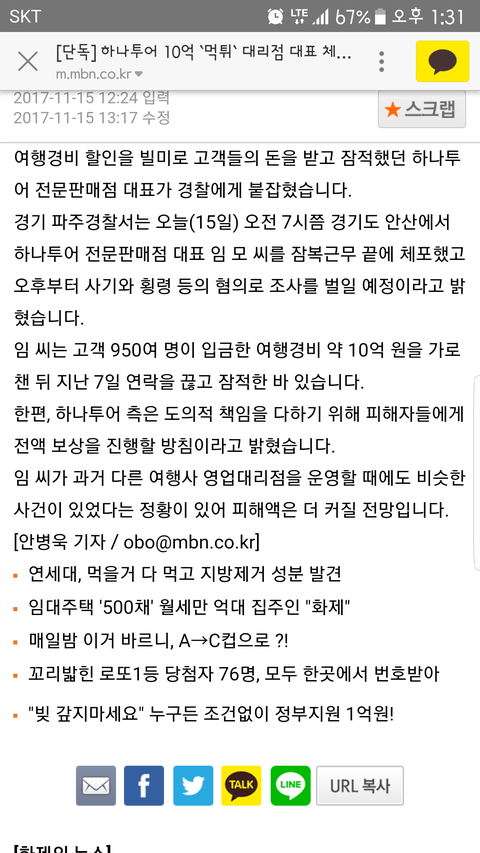 어제 기사화된 사기사건 대표가 잡혔는데...이게 더 빡치네요...이미 이런 전적이 있는 그 대표...하나투어에선 전문판매점을 내주었네요...저희어머니껜 우수판매점 수상햇다고 자랑햇다던데...오늘도 하나투어에선 저희어머니께 기다려달란...결정사항이 없단...빙빙 돌아가는 대답뿐...