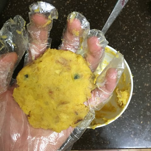 2.일회용장갑끼고 고구마으깬거를 넓게 펴줘!!