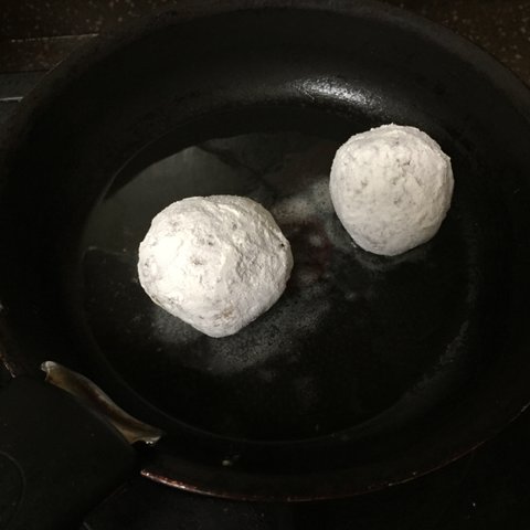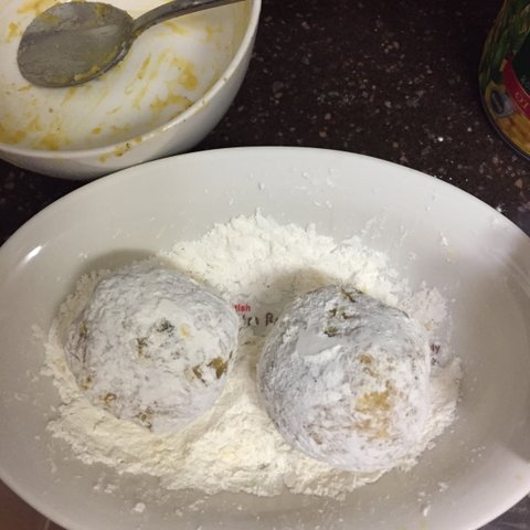 3.잘 동그랗게 손바닥으로 굴려(?)서 튀김가루에 뭍혀줘!! 나는 두번했는데 한번정도가 좋을고 같앙!!