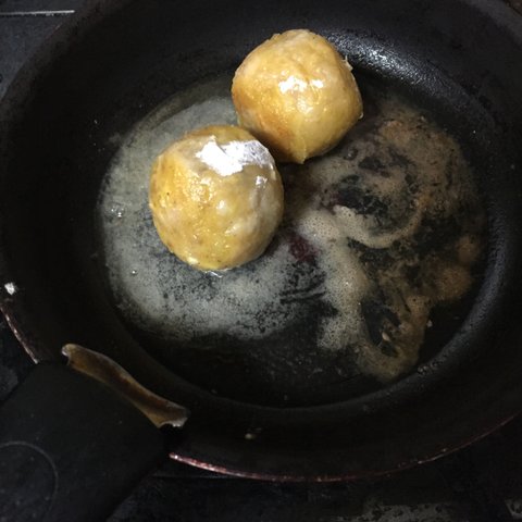 4.기름쫌 넉넉히 해서 약불로 달궈준다음 5분정도 굴려가면서 튀겨줘 근데 별로 튀겨지진않아서 ...그냥 굽는다고 생각해줭... 막 부침가루때문에 흰기름..?처럼됬는데 내가 튀김옷 두번했을때 부터 그러더라 ㅠㅠ 튀김옷은 한번만!!!!!!