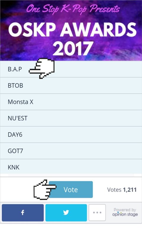 https://twitter.com/vote4bap/status/930829325636485121 여기들어가면 링크있는데 7개 다 투표하자!! 지금 성적좋으니까 유지하게 열투‼️