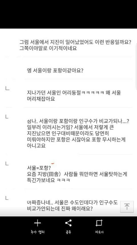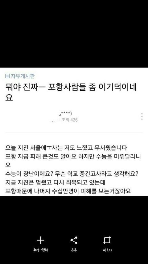 니네 지진 제대로 느껴본적있어? 포항에서말이야 아니면 경주라던지 겪어본적업으면 별거아니라고 우습게 말하지않아줬으면 좋겠어 ㅜㅜ나는 포항사람이고 19살인데 니네 처럼 수험생은 아니야