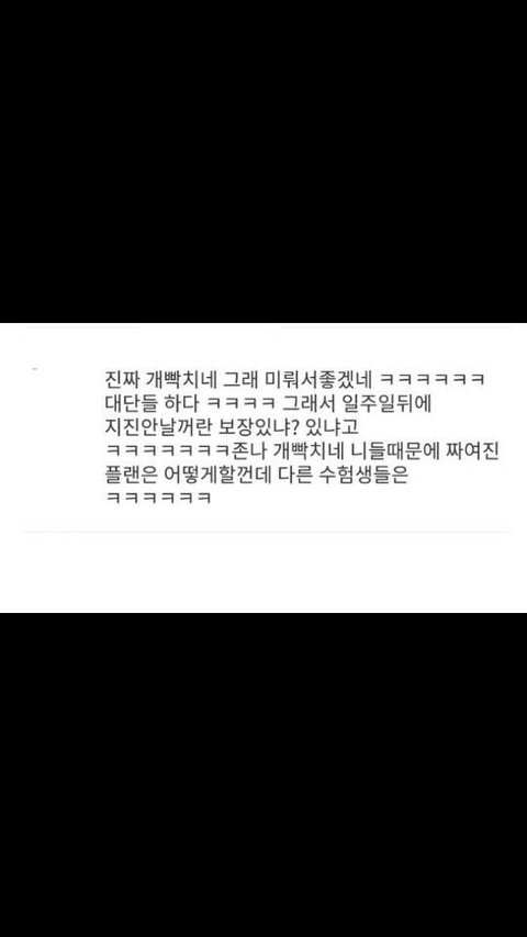 상가 유리 다 깨지고 건물 흔들리고 여진마저도 계속오니까 얼마나 무서웠는지알아? 전화도 안터지고 내 친구는 그 와중에 문제집 풀고있었다고해 포항애들도 정말 열심히해 목숨걸고해 오늘도 친구한테 받아야할게있어서 10시쯤에 초콜릿 사들고 가려니까 자야한다고 안된데 그래서 더 일찍간다고 말했었어 다른 지역애들도 엄청 열심히했는데 일주일 연기라 속 터질꺼는 아는데 정말 포항애들도 지금 얼마나 힘든지 알아줬으면 좋겠다 만약 다른지역에서 지진이 났어도 연기가 됐을텐데 지진나서 무서워 죽겠는데 욕까지 먹으니까 얼마나 서럽겠어 그러니까 그냥 좋게생각해줬으면 좋겠어 계속 땅이 흔들리는게 느껴져 미세한 떨림도 이제 무서워 정말 애들아 우리가 연기시키고 싶어서 연기시킨게 아니라 나라에서 시킨거야 애들도 화내 내일만 지나면 자윤데 이러면서 제발 우리 속도모르면서 욕 하지말자 부탁할게 저런글 보일때마다 너무 속상하다ㅜㅜ