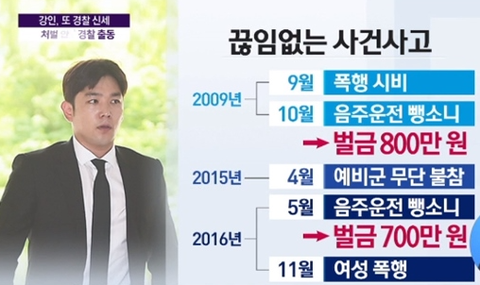강인은 앞서 2009년과 2016년 뺑소니, 폭행, 예비군 불참, 두차례 음주운전을 해 벌금형을 선고받은 적이 있다.