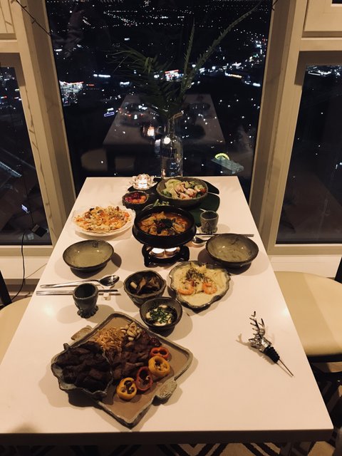 등심스테이크,토마토해물스튜,가지편채,샐러드,교촌치킨(배달)