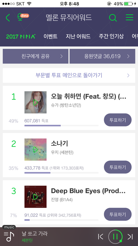 멜론 어워드 핫트랜드 부분 소나기 투표 해주라 ㅠㅠ