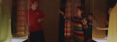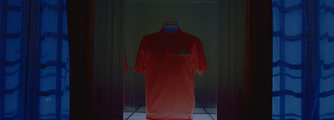 뮤비에서 다른 피자 배달부 유니폼들이 전시되어있음