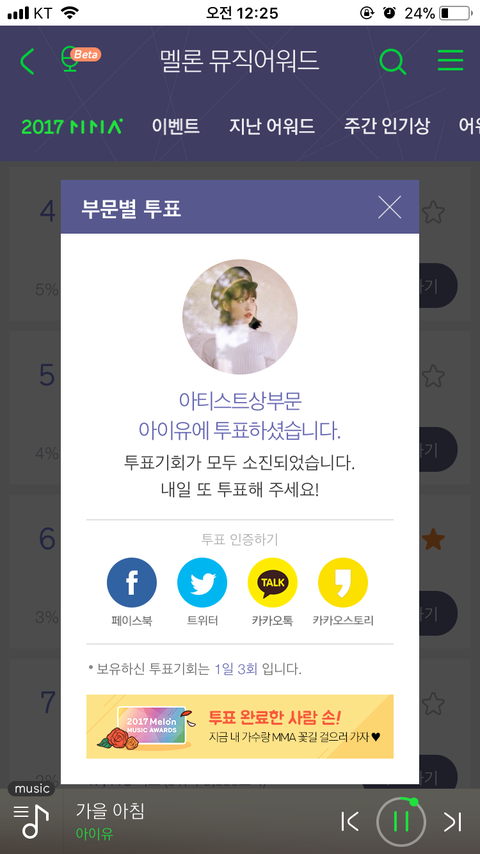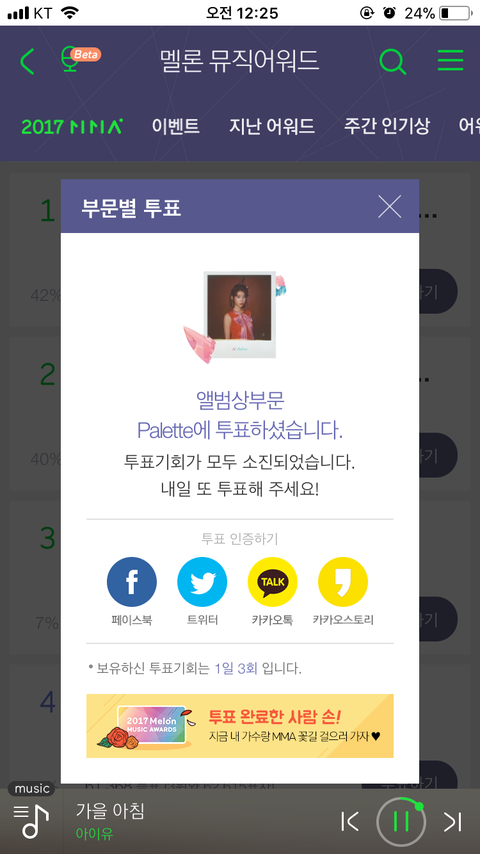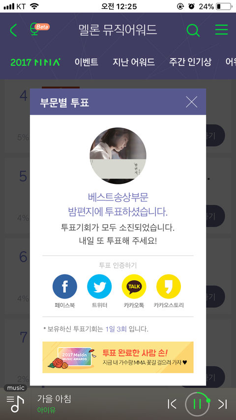 베스트송 부문 6위로 떨어졌어 지금 표차이 얼마 안나니까 까먹지 말고 투표 해줘ㅠㅠ