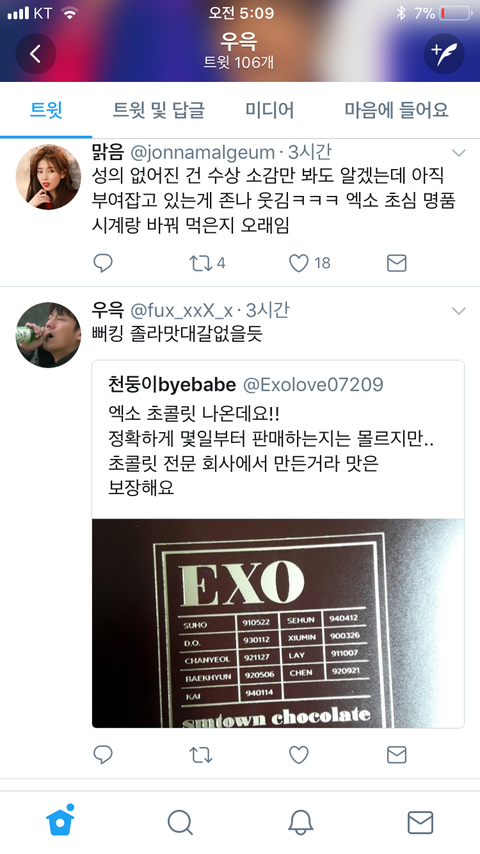 가끔보면 내가 바빠서 덕질제대로못할때보다 관심더많은듯 스케줄있을때마다 스케줄찾아보고 영상보고 까글쓰는거같은데 조카안쓰럽더라 왜그러고살지...? 초콜릿맛없을꺼같단글도조카웃김ㅅㅂㅋㅋㅋㅋㅋㅋㅋㅋㅋㅋㅋㅋ
