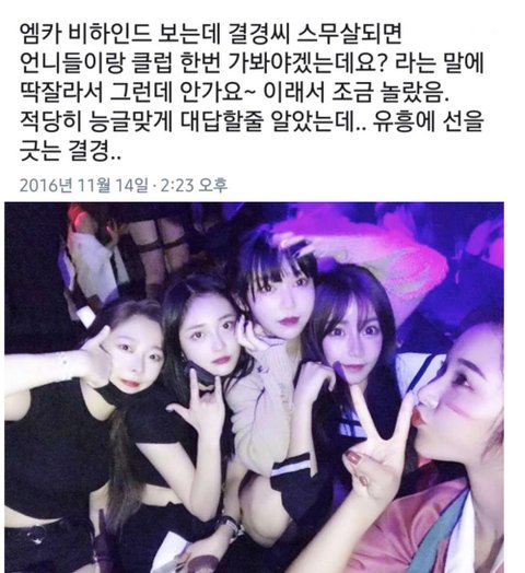 이거 올해 성인되고 나서 간 사진이고, 클럽 안가요~ 한건 작년 아오아 팬싸에서 한 말임ㅇㅇ. 성인이 클럽간 건 문제 될 게 없다고 보는데? 그리고 저 사진은 클럽 다니던 사람이 주결경 정은우 만나서 찍어 올린 사진인데 저 사진 한장으로 클럽 죽순이라는건 어떤부분에서 알수있음?
