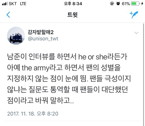 또는 girlfrend or boyfrend 아니면 The Army라고 불특정 성별로 묶어서 말하고 ㅠㅠ 진짜 말 조심하려는게 보이구 또 정말로 좋은 사람이 되려고 노력하는게 눈에 보여... 진짜 내가 여태껏 본 사람들 중에 점점 나아지고 사랑받으려고 노력하는 사람중 하나야. 이래서 안 사랑할 수가 없다.