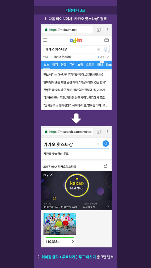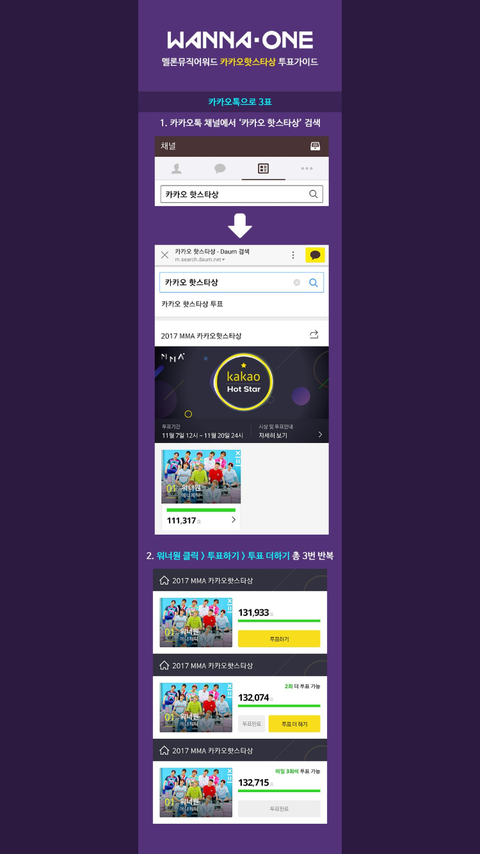 지금 2등이랑 격차가 줄어드는 바람에 워너원이 뺏길 위기에 처해있어 ㅠㅠ 한명당 하루에 9번씩 투표할 수 있어 투표하는 방법 올려 놓을테니 꼭꼭 투표해줘 마감 이틀남았는데 1등뺏기기엔 아쉽잖아 안 그래 ?