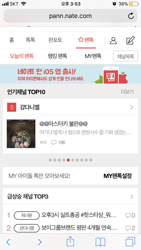 않이 팬톡 인기 채널 5등 실화야...? 우리 데뷔 직후에 여기 쫓겨나듯이 와서 시작했는데 이렇게 커서 너무 뿌듯하다ㅠㅠ