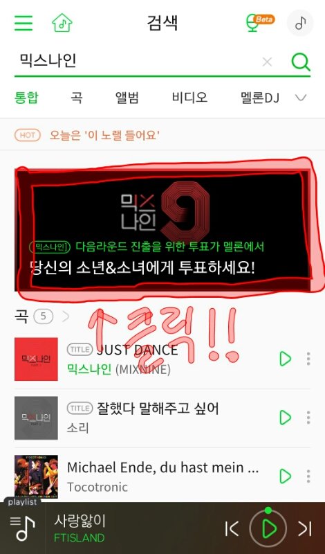 멜론에 들어가서 검색에 믹스나인 검색ㄱ