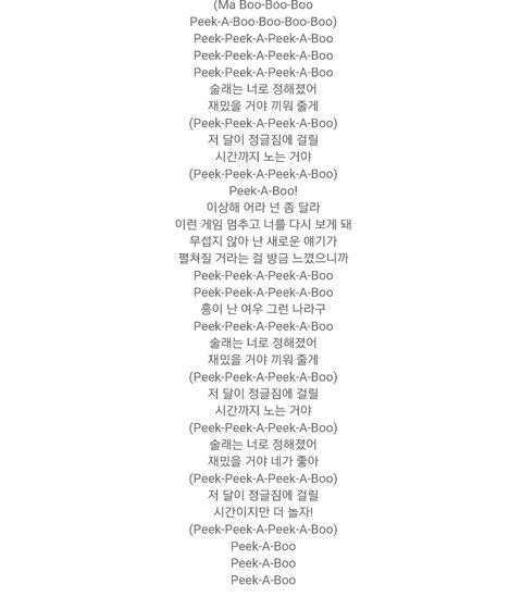 피카부 가사에서는 딱히 그 전 노래들이랑 연관성이 없어보임. 근데 뮤비랑 티저에 떡밥이 많은듯 가사는 걍 참고하셈 단서되는게 있을수도 ㅋㅋ 그리고 피카부 티저를 보면 무지개색 옷을 입은 멤버들을 볼수있는데 아크케 가사에 '무지갤 그려대는 저 분수대 보다 난 사랑을 그려대는 네게 좀 더 끌릴거야' 이렇게 무지개가 들어가는 가사가 있고, 빨간맛 가사에서도 '일곱개의 무지갯빛 문을 열어 너의 세상은 짜릿해 멋있어' 이런가사가 있음 티저든 가사든 다 무지개가 들어가는게 공통점인데 의미를 모르겠음.... 아는사람 댓글점...