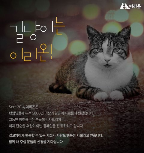 이리온이라는 동물병원에서 길냥이 서포터즈 모집하고 있어요.예전에 사료후원 받아서 길냥이 준적있었는데 후원이 중단됬었는데 다시 서포터즈식으로 모집하나봐요.