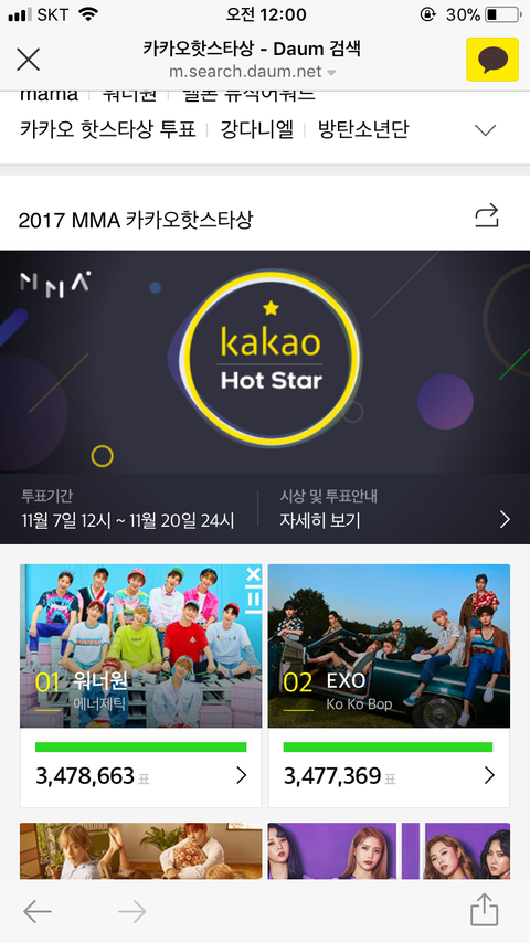 11시반부터 5분간격으로 몇천표씩 격차가 줄어들길래 못 탈 수도 있겠다 생각했는데 우리가 천삼백표차이로 카카오 핫스타상을 타게됐어 ! 너희들이 꾸준히 투표해준 덕분이야 다들 투표하느랴 지인한테 부탁하느랴 고생 많았어 ❤️ 워너블 사랑해