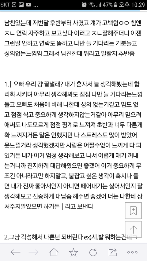 이글 쓰닌데 1번으로 해봤거든 근데 저나가 와서 받아봤거든 그러니까 글쎄... 일단 내가 널 좋아하는거 하난 확실해 근데 내가 일을 하고 그러면서 생활패턴이 엉망이 되고 나도 많이 힘들어 전여친 사귈때도 이랬거든ㅇㅇ 왠지 계속 이대로 가다간 첨이야 괜찮겠지만 계속 너가 많이 외롭고 상처받을거같아 니가 계속 감수를 해야할거야.. 우리가 뭐 결혼하거나 그럴사이도 아닌데 그렇게 감수를 해가며 니가 상처를 계속 받아야하나 싶어 넌 어떡하고싶어?해서 내가 지금 생각이 정리가 안돼 하니까 그럼 생각해보고 얼마후 연락을 아예 끊어버리던 어떡하고싶은지 연락을 주래 내가 알았다고 늘 배려없어서 미안했다 하니까 아니야 내가 이렇게 됳걸 예상하면서도 맘만 앞서서 너한테 사귀자한게 잘못이지 잘지내 하며 끊을려다가 마지막에 픽웃으며 그래도 나 너 많이 좋아했다?ㅋㅋ 하며 끊더라 이거듣고 제일 슬펐던거같아 어떡해 진짜..잠도 안와 잘지내 이 세글자가 왜케 눈물이 쏟아지는지..
