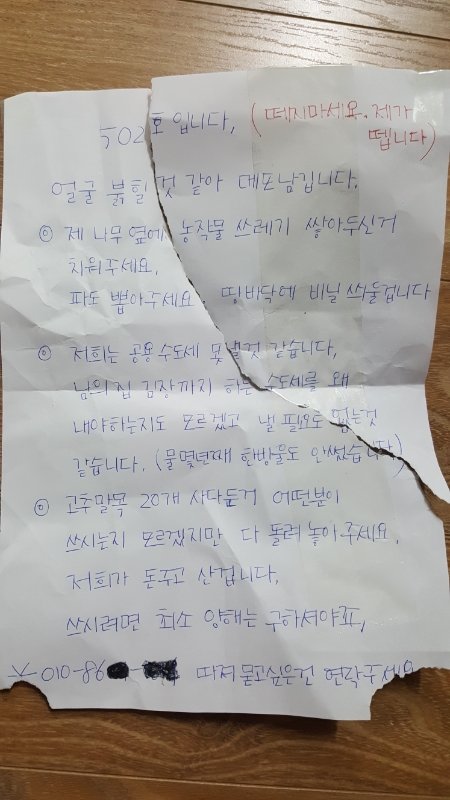 그리고 일요일날 아침 쓰니가 붙여 놓은 A4용지가 뜯겨 없어진걸 보게 돼서 (떼지말라고 쓰니가 뗀다 적어 놨었음)