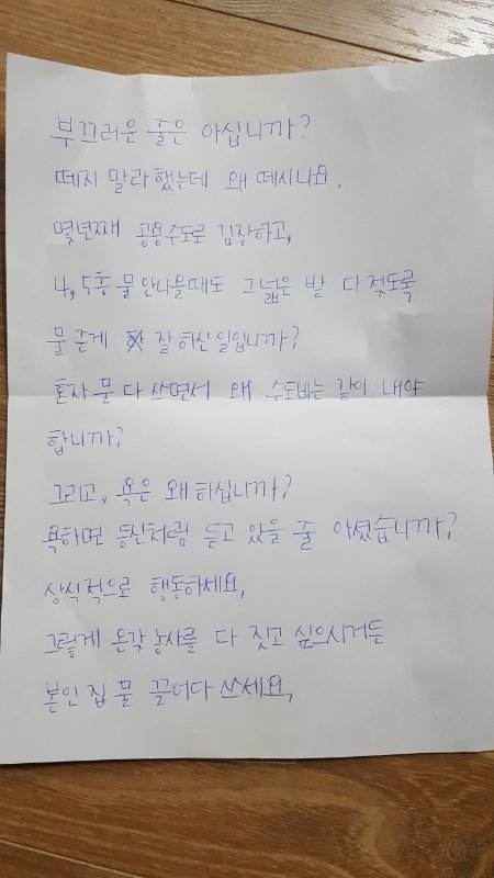 왜 그렇게 욕을하냐고. 욕하면 그냥 듣고 있을 상등신인줄 아셨냐고 적어 붙여 놓고 나갔음.