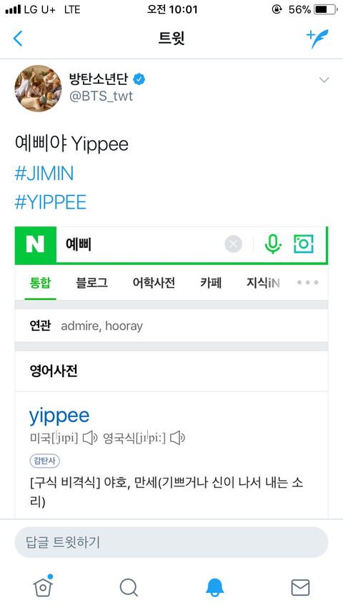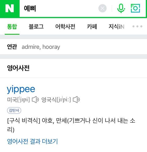 여기서 지민이의 세심함✨ 영어로 yippee 라고 친 후에 검색창에다 예삐라고 바꾸기ㅋ큐ㅠㅠㅠㅠㅠㅠ 그냥 예삐라고 치면 저렇게 안나와ㅠㅠㅠㅠㅠ