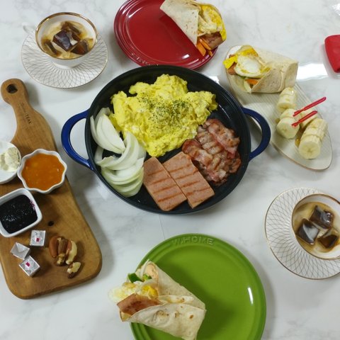 ㅎㅎ네오**에서 냄비세트를 하나 장만했어요. 가격은 비슷비슷했는데, 사진속에 저 둥그런 그릴후라이팬주시길래 얼른겟했어요. 브런치해먹을때 유용합니다. 다른 여러모로요. 전날 카누에 물 조금만 넣어서 에스프레소만들어 얼음틀에 얼려놓고 우유만 비우니 라떼완성! 또띠아는 재가 대학시절 **날드에서 스낵랩 만들던 솜씨로 만들어보았습니다.