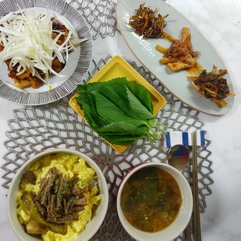 장조림한김에 버터장조림밥 만들어보았어요. 장조림 짜지않게 해서 저정도는 올려야 맛이나더라구요 그나마 최소한의 양심은 배추넣은 된장국입니당