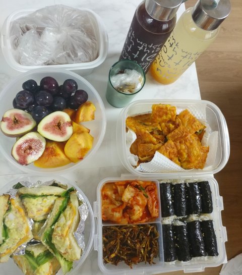 지1에서 노니 역시 시간이 남아서 남편회사에 보낼 도시락을 좀 싸보았어요. 남편이 마른김에 밥싸서 간장에 찍어먹는걸 졸아하거든요. 다른분들 취향은 모르니, 김치도 넉넉하게 넣어서 충무김밥으로 드시라고 했어요. 된장국과 반찬들 그리고 남편 좋아하능 애그샌드위치도 넣었어요. 반응이 나쁘지 않아서 좋았습니다.