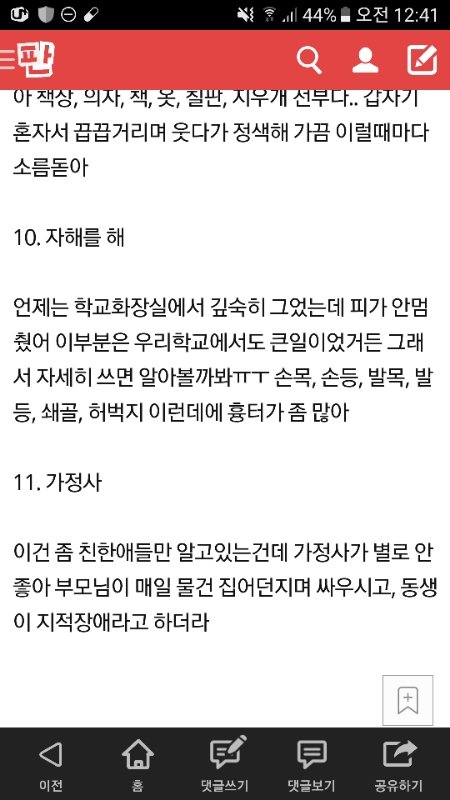 +) 내이야기 아니냐는 댓글이 많아서 추가해 내친구는 3월부터 지금까지 봐왔고, 워낙 특이한? 이상한? 행동을 많이 하는지라 걔가 했던 행동이 다 기억나진 않아ㅎㅎ 글을 쓰려고 했는데 기억해내면서 쓰다보니까 어쩌다가 내 이야기인것처럼 써졌어 10번에 대해서 뭐라고 많이 하던데 흉터 있는곳을 어떻게 자세히 아냐면 여름에 놀때 반바지를 입거나 샌들이나 슬리퍼 신었을때 안거야 내가 손목자해까지는 알고 있어서 다른데에도 자해하는지 좀 유심히 봤거든 그리고 깊숙하게 그었는데 피가 안멈췄다 이부분은 그때 점심시간이었거든 그런데 얘가 밥을 안먹는대. 그래서 나는 놔두고 다른친구들이랑 갔지 그런데 교실에 와보니 얘들이 ㅇㅇ이가 다친것같더라 피흘리면서 병원실려갔다 이런 이야기를 하는거야(실제로 구급차 불렀어 지혈이 안되서) 그런데 나중에 ㅇㅇ이를 보니까 손목에 붕대를 두르고 있더라 그리고 다 나아서 붕대 풀고 왔을때 손목에 좀 큰 흉터가 있었던거고,, 아무튼 주작아니야 내가 이런걸로 관심이나 얻자고 긴글 쓰는 한가한 사람도 아니고 무엇보다도 고2인데 이런글 쓸 여유조차도 없어 하지만 친구다보니까 안타깝고 얘가 왜 이러나 싶어서 물어보고 도움청하려고 올려본거야 주작이나 심한욕하지 말아줘 모두 고마워ㅎㅎ