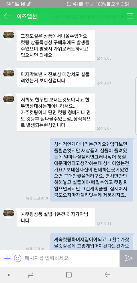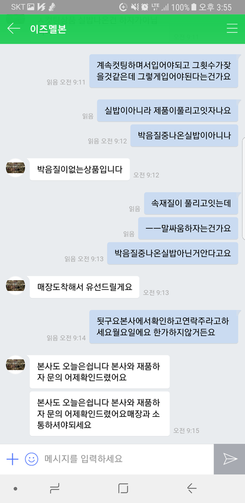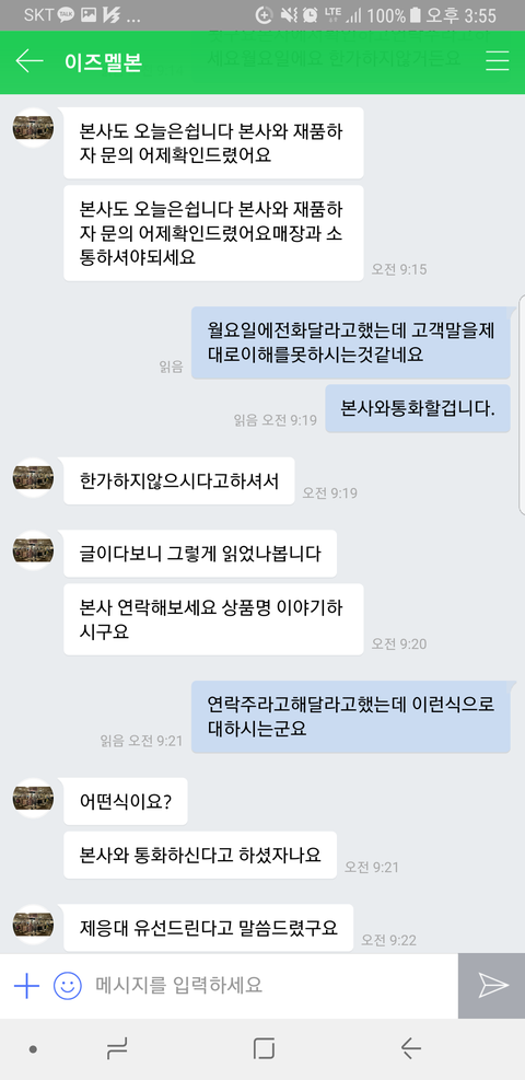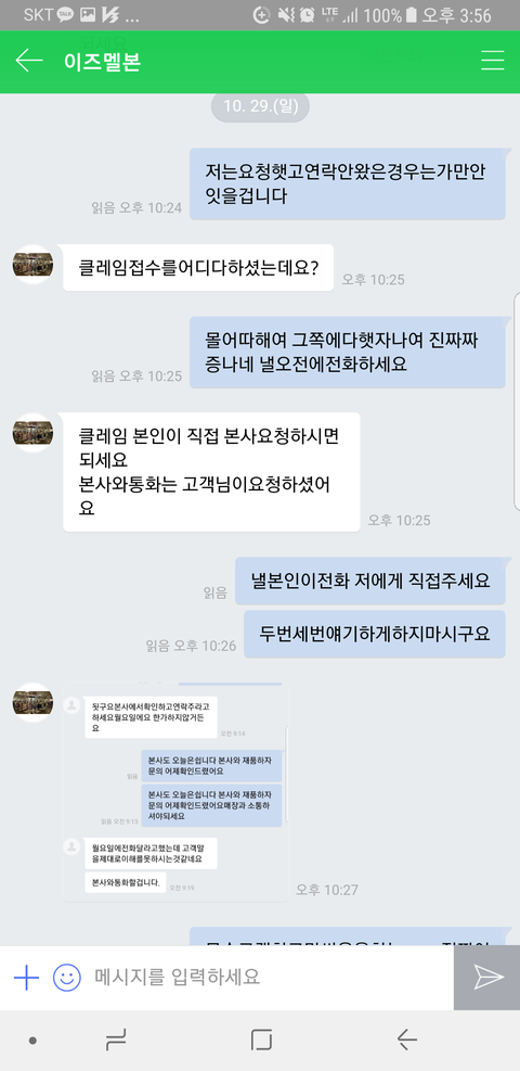 그래서 네*버 톡으로 문의를햇어요! 토요일에 글남기면 월요일답변오겠지햇는데 답이계속오는거에요. 빠른답변이라좋아햇는데 매니져라는분이 상식적으로 이건아니죠 라는등 말꼬리를잡고 늘어지는등 저선배한테혼나는느낌이엇어요. 기가막힌건 이걸이해못하겠으니 본사와통화하게해달라니 직접하래요. 밑에캡쳐보면 본사쉰다 다쉰다 계속자기말만하고ㅡㅡ
