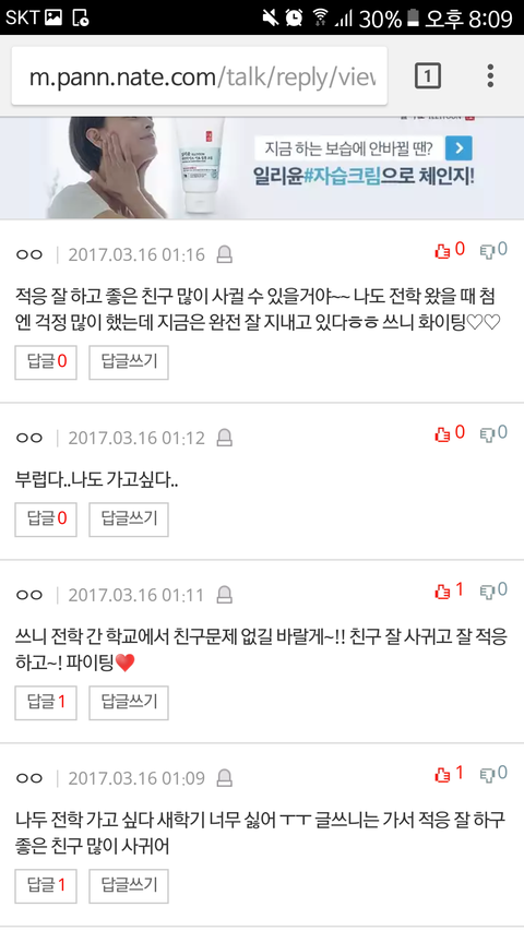 별 거 아닌 글이지만ㅋㅋㅋㅋ 예전에 내가 썼던 글 보다가 발견한건데 벌써 시간이 이렇게 지났나 싶고 저때 댓 남겨줬던 얘들 넘 고마웠다 솔직히 지금 전학와서 좀,, 힘들긴해도ㅎ 진짜 응원 됐었음ㅠㅠㅠㅠ