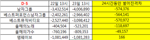❌22,23일 12시기준 24시간격차(남그룹400만...)❌