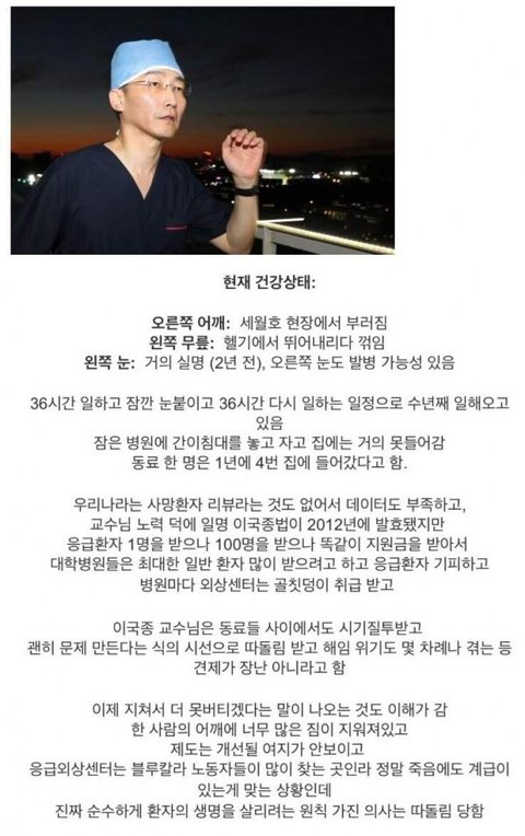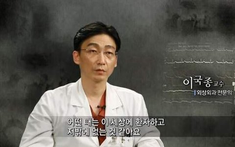 그리고 유튜브나 네이버등 검색사이트에 이국종 교수님의 성명또는 이국종교수님 이렇게 치면 영상들이 많이 나와 현재 중증외상센터나 병원의 현실 , 의사 간호사분들의 모습을 보여주는데 시간나면 꼭 봐줬으면 좋겠어