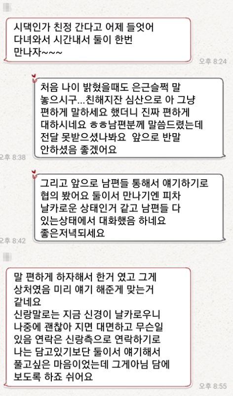 “언니한테 말 편하게 하시랬더니 너무 편하게 호칭을 니라고 하실줄 몰랐다 어려서 무시하는건지 앞으로 반말 안하셨음 좋겠고 뭔일있으면 연락 미리주신다면서 이건 아니네요 앞으로 뭔일 있으면 연락 주세요 미리 알고나 있으면 스트레스 덜받죠 아님 그시간에 밖에 카페를 가든 친정을 가든 어디라도 나가게요“