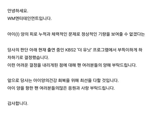 소속사 피셜은 건강상 문제로 자진 하차 했다고 함
