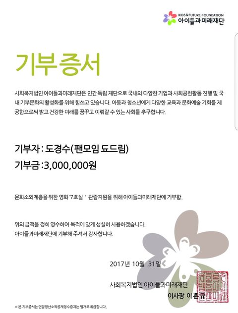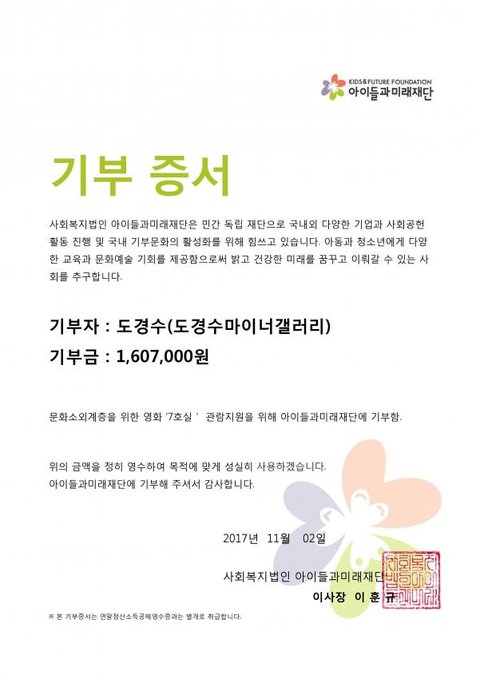 경수팬 소외계층 아동들에게 영화 '7호실' 티켓 기부