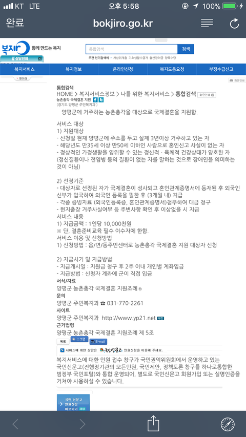 외국신부사오면 천만원 주는 경기도 양평군청복지