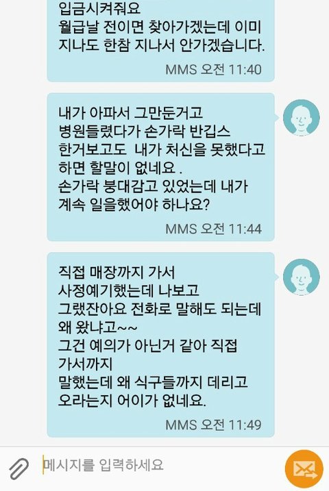 저희 어머니가 "사장님 손이 너무 아파서 일을 계속 못하겠어요. 사람을 구해주시면 좋겠어요."