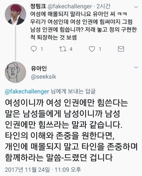나도 페미니즘이야 좋다고 생각하는데 트위터에 지들이 ㅈㄴ 깨어있는 줄 아는 여성우월주의자 너무 많음... 무논리 갑임 유아인이 맞는말해도 말투가지고 웅앵웅거림;; 극혐