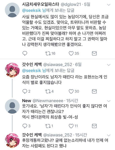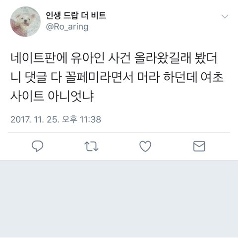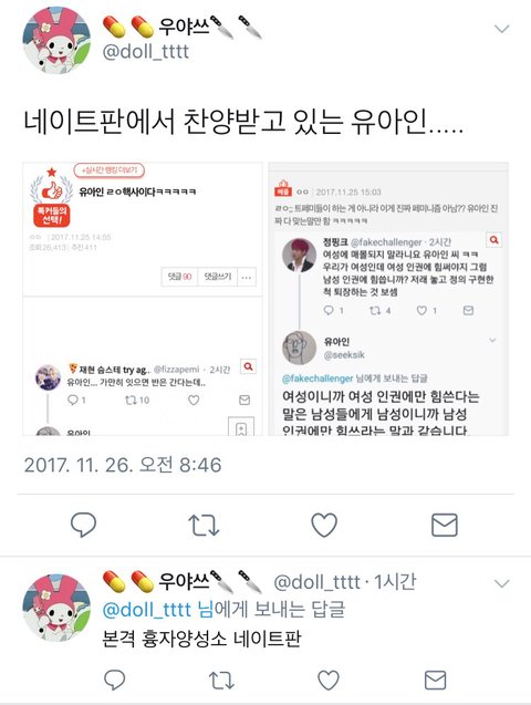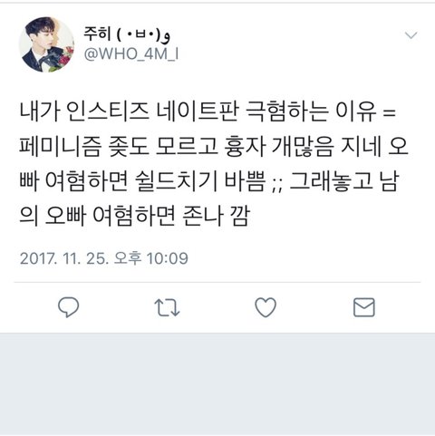 트페미가 아무리 과격하다고 해도 이번 유아인이 발언한건 페미니즘에 어긋나는 말임. 참고로 유아인은 자기가 페미니스트가 되고싶다고 인터뷰했어. 근데 몇몇 사람들은 유아인의 잘못된 발언을 보지 않고 유아인이 메갈을(페미를) 깠다며 며칠전까지 군대가라고 거품물던 사람들이 형,형 이러고 감싸돌지. 뭐가 이중잣대인지 모르겠음? 사람들이 가지고 있는 사상에 깊이도 모르면서 그걸 가볍게 치고 무시하지 마셈. 그러니까 너네들보고 흉자라 그러고 한남이라 그러는거임. 너네들은 페미들보고 메갈,꼴페미라 가볍게 부르면서 왜 반대로 흉자,한남이라 말하면 세상 다 잃은 것처럼 부르르 떠는지ㅋㅋ