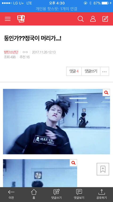 한 이삐가 정국이 머리 모양 다르다고 글 올렸었는데 리액션 영상에서 정국이가 이거 따로 찍은거라고 그랬옹!! 거울이 아니었다는....비밀이 밝혀졌다~~~