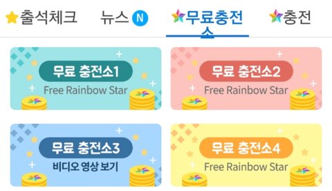 무지개별 받는 방법은 무료충전소 들어가서 광고보기/어플설치/얼굴책좋아요/가입 등 여러가지